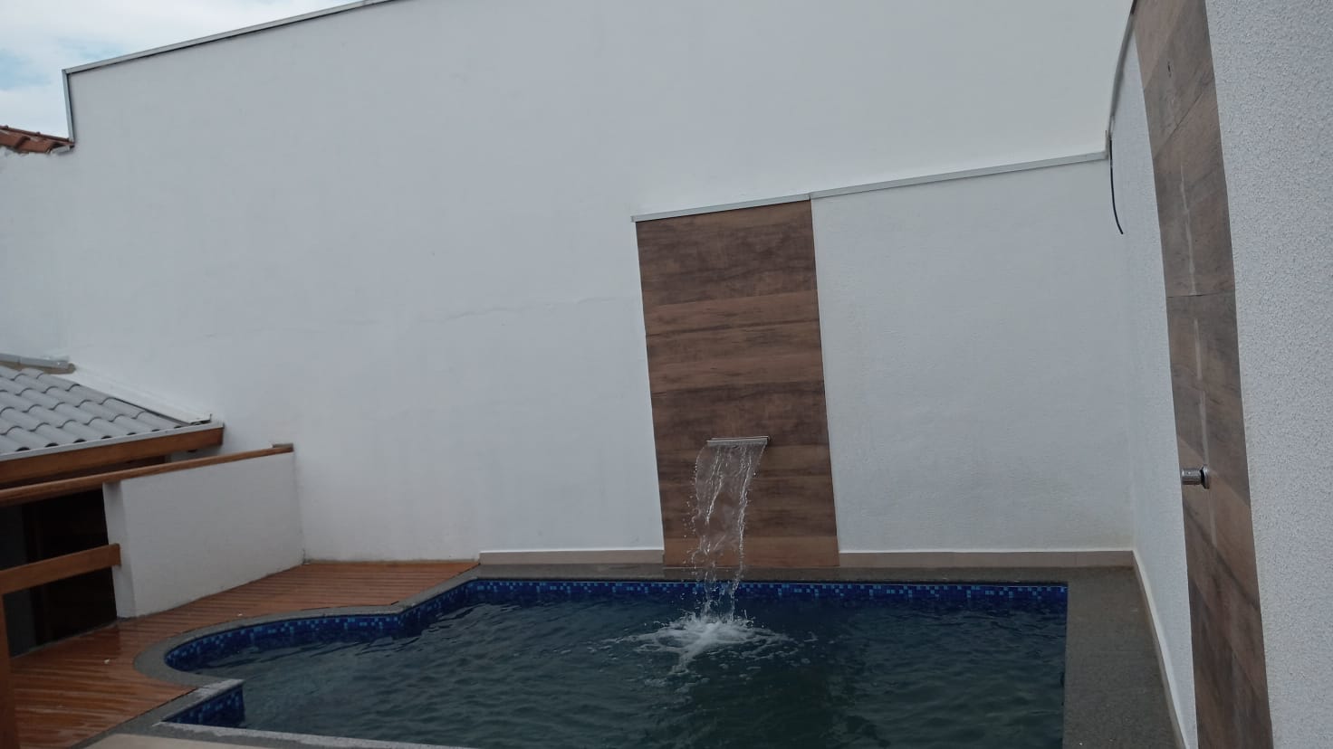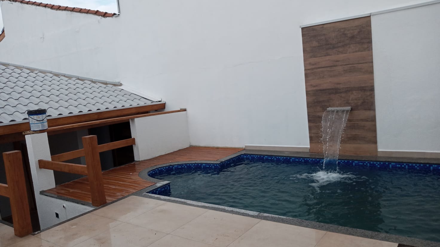 Piscina com cascata, pergolado de vidro e madeira.