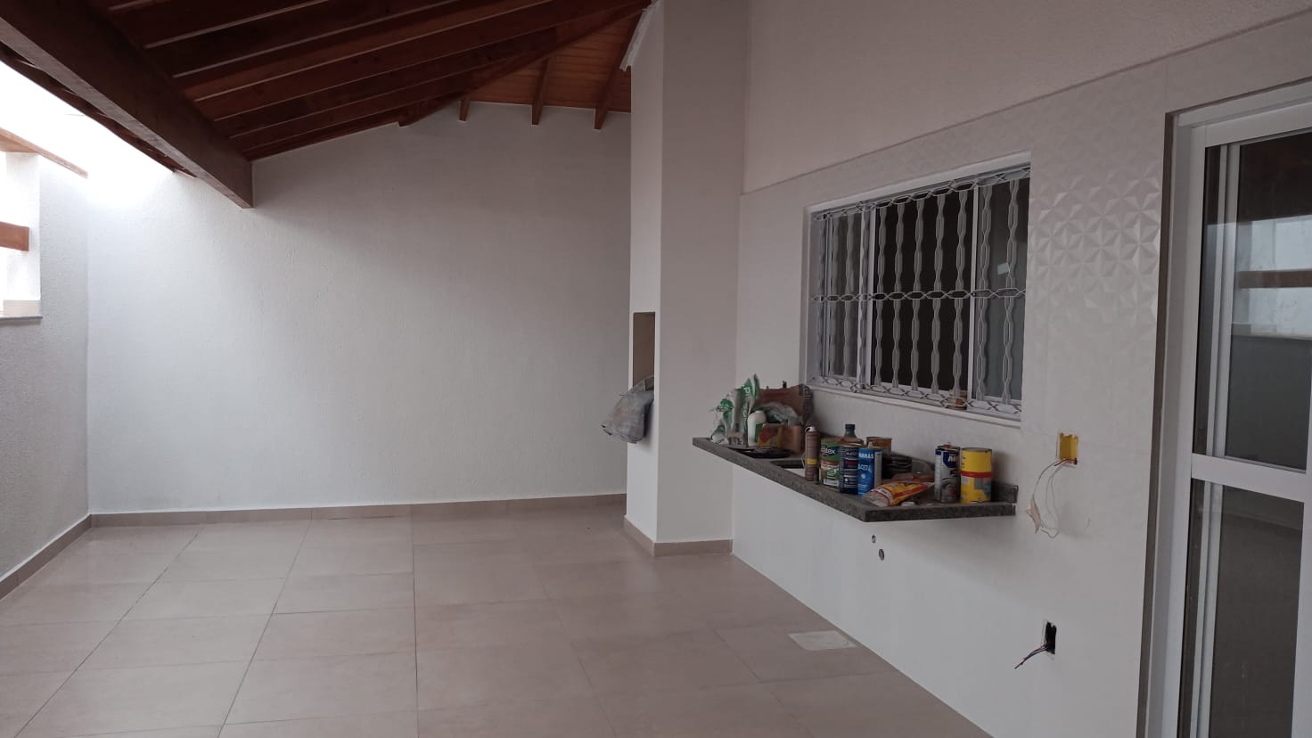 Área externa com rancho coberto com churrasqueira e 1 banheiro. ]